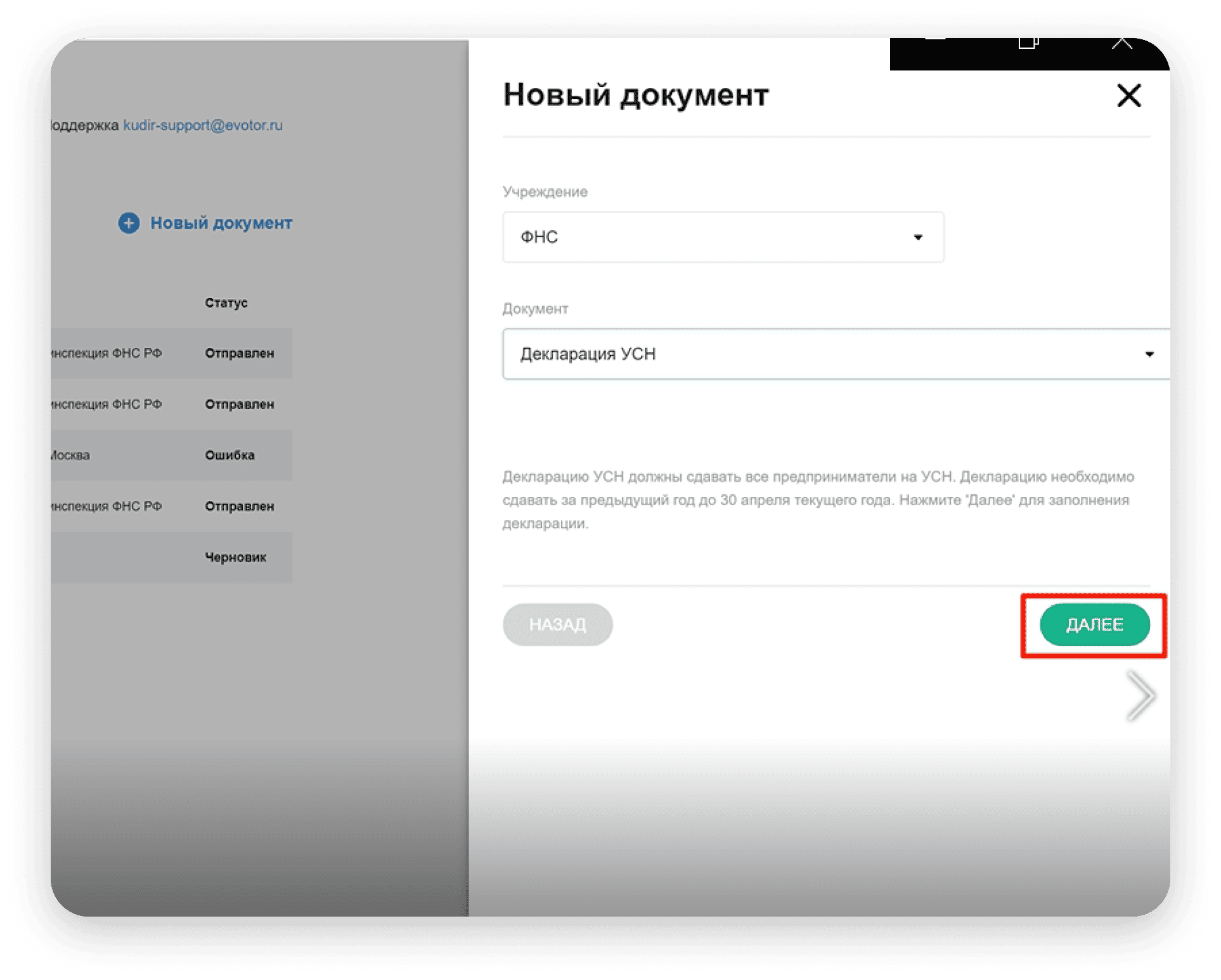 5. В поле «Документ» выберите декларацию по УСН и кликните «Далее» — после этого автоматически запустится мастер заполнения.