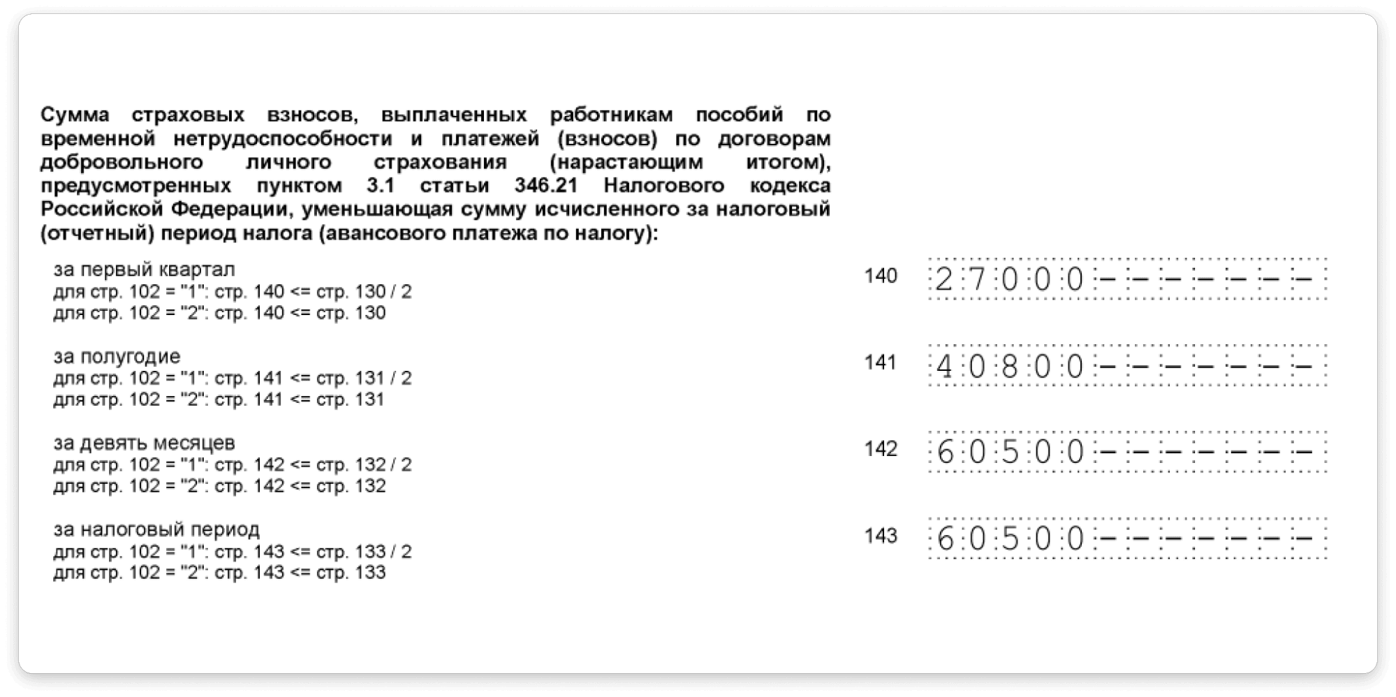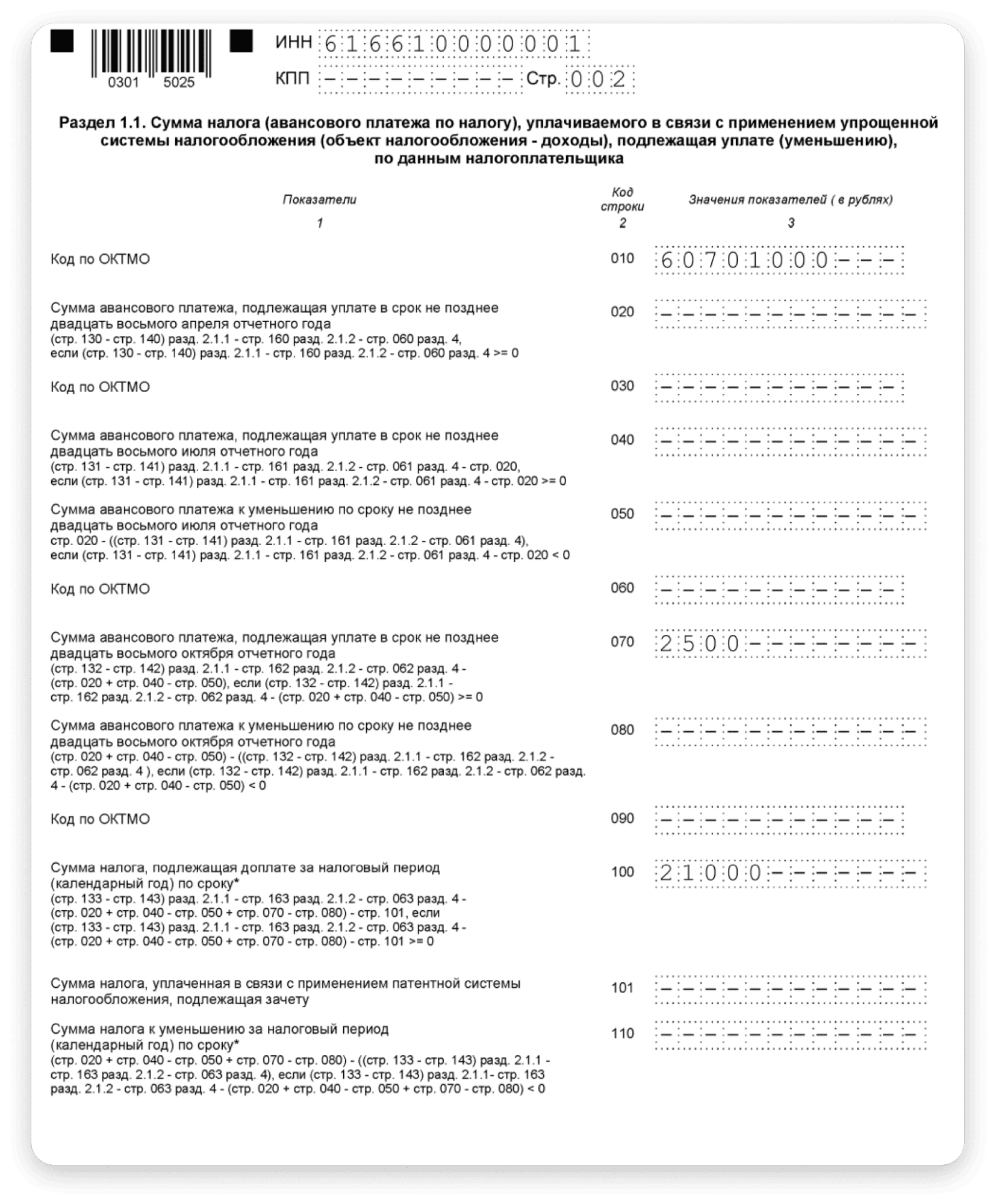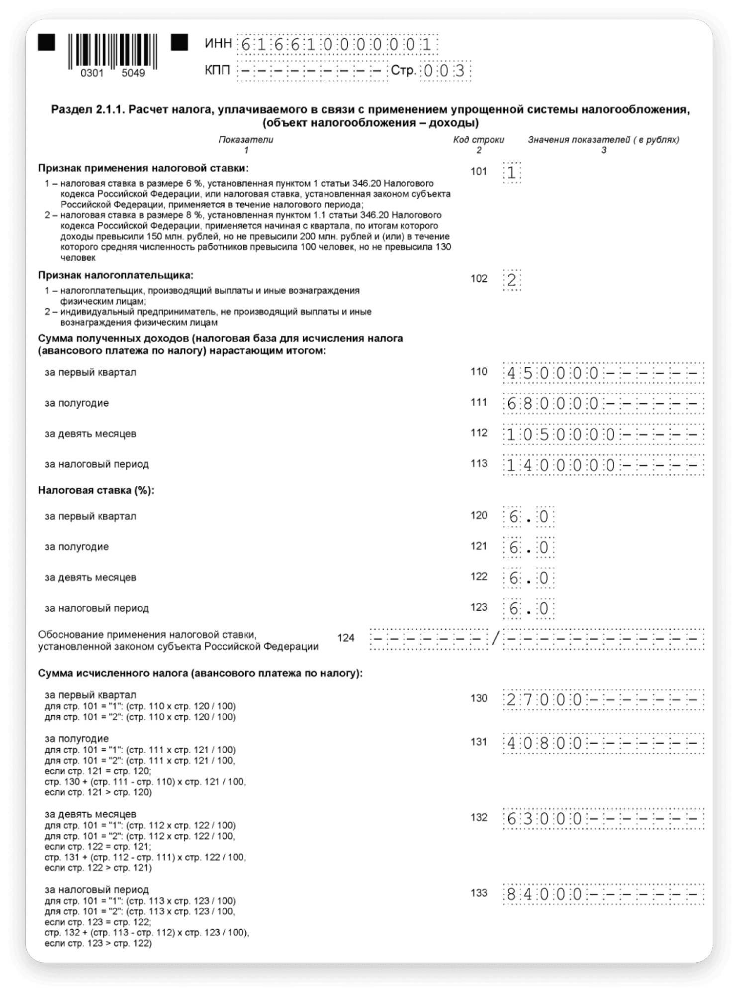 - раздел 2.1.1 — главный рабочий блок: доходы, страховые взносы, пособия, работники, итоговый налог и авансы. Если у вас есть сотрудники, налог можно сократить максимум наполовину. Если работаете один — уменьшить до нуля;