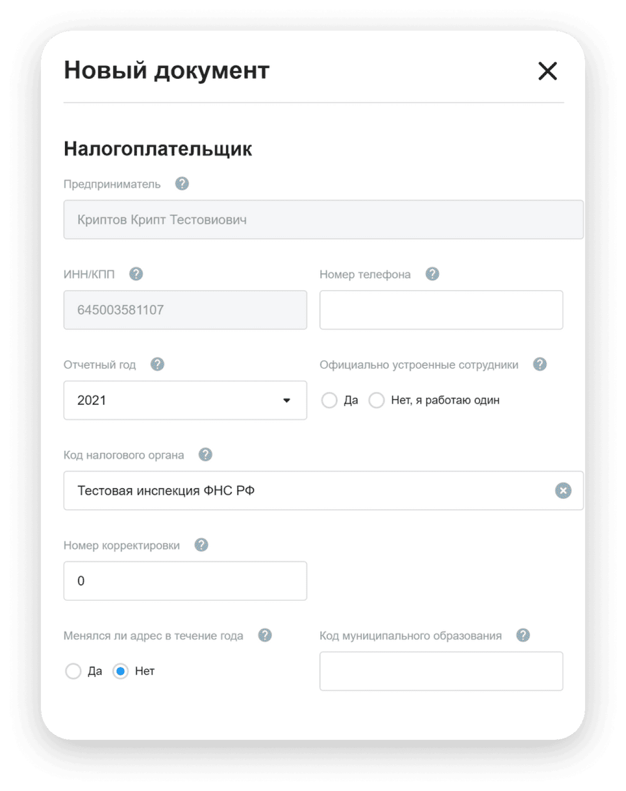 Часть полей система подтянет автоматически — данные возьмутся из вашей ЭЦП, зарегистрированной в сервисе. Остальное нужно заполнить вручную: