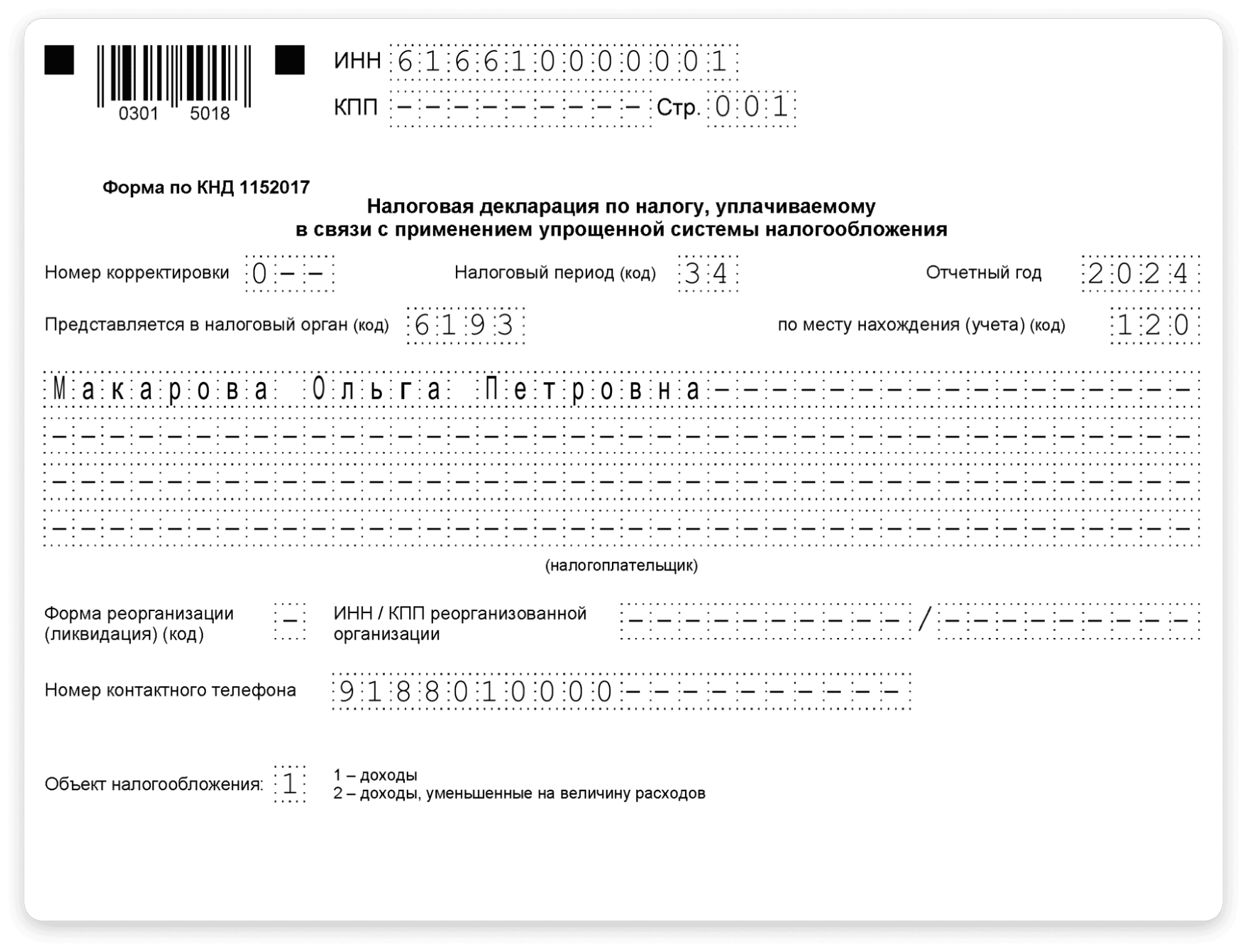 Рассмотрим, как заполнить декларацию УСН 6% на примере предпринимателя без сотрудников, выбравшего налоговый режим УСН «Доходы». Для начала ИП нужно заполнить титульный лист. Его можно заполнить прямо на компьютере или распечатать и заполнить вручную синей ручкой. Титульный лист и каждый раздел декларации нужно распечатать на отдельном листе — печатать с двух сторон листа нельзя.