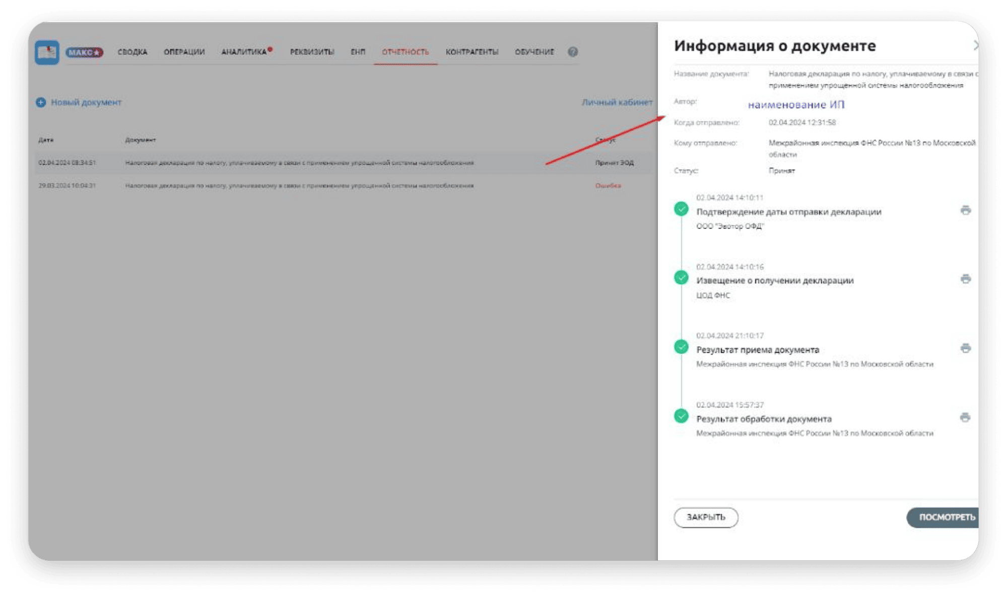 Кликните на нужную декларацию — откроется вся информация о документе: кто её заполнял, дата отправки, получатель, текущий статус и все шаги процесса сдачи.