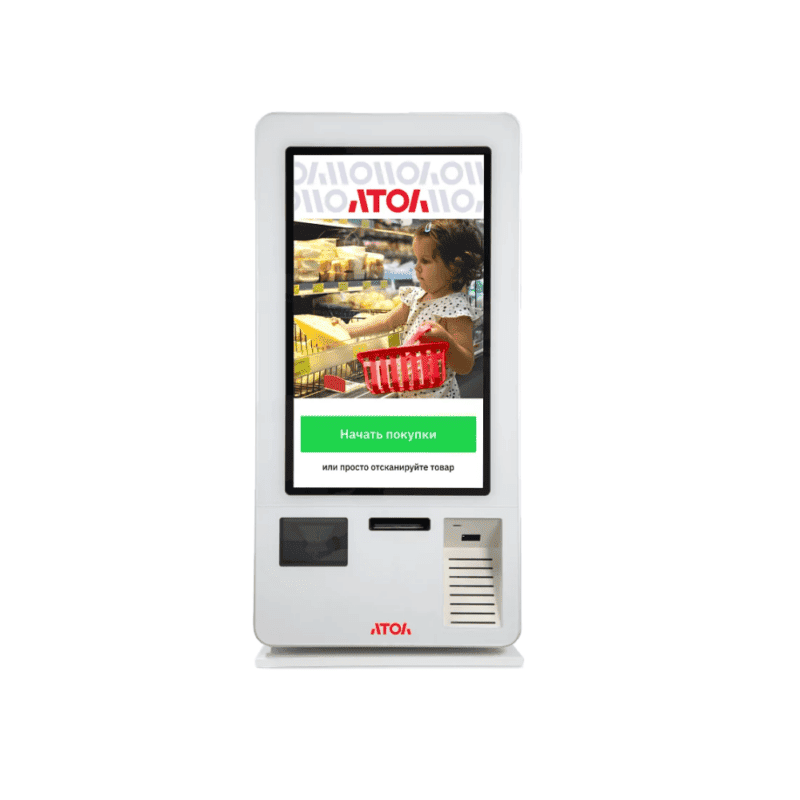 Напольные — это цельный терминал в корпусе с большим сенсорным экраном, встроенной онлайн-кассой, сканером, принтером чеков, терминалом для карт. Часто дополняются полками с пакетами или небольшими корзинами для импульсных покупок.