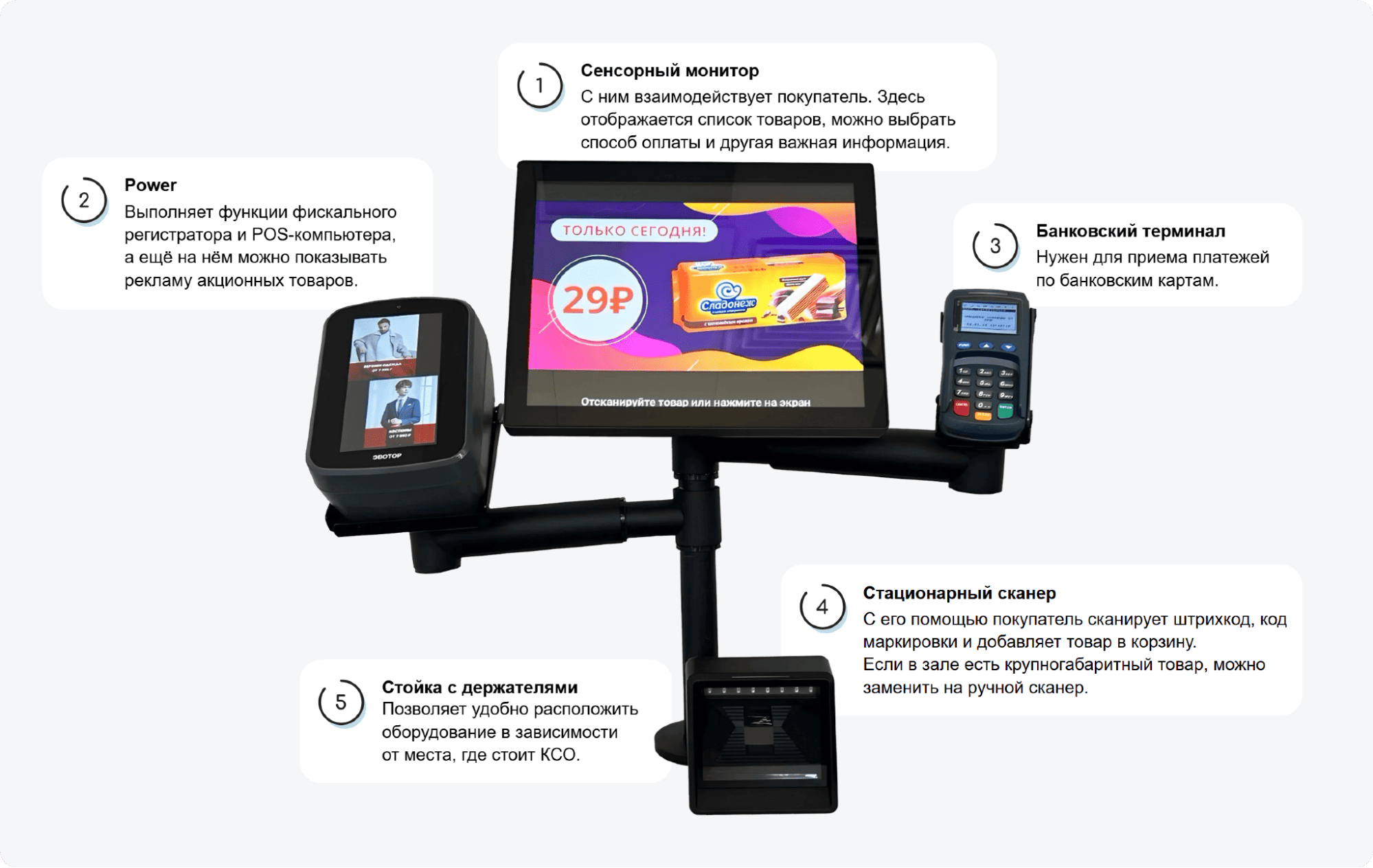 💲Стоимость обычно стартует от 100 000 ₽, поэтому настольные КСО доступны даже малому бизнесу. Есть и более дешевые варианты. Например, минимальный комплект КСО для небольшой зоны самообслуживания от Эвотора обойдётся от 45 050 ₽.