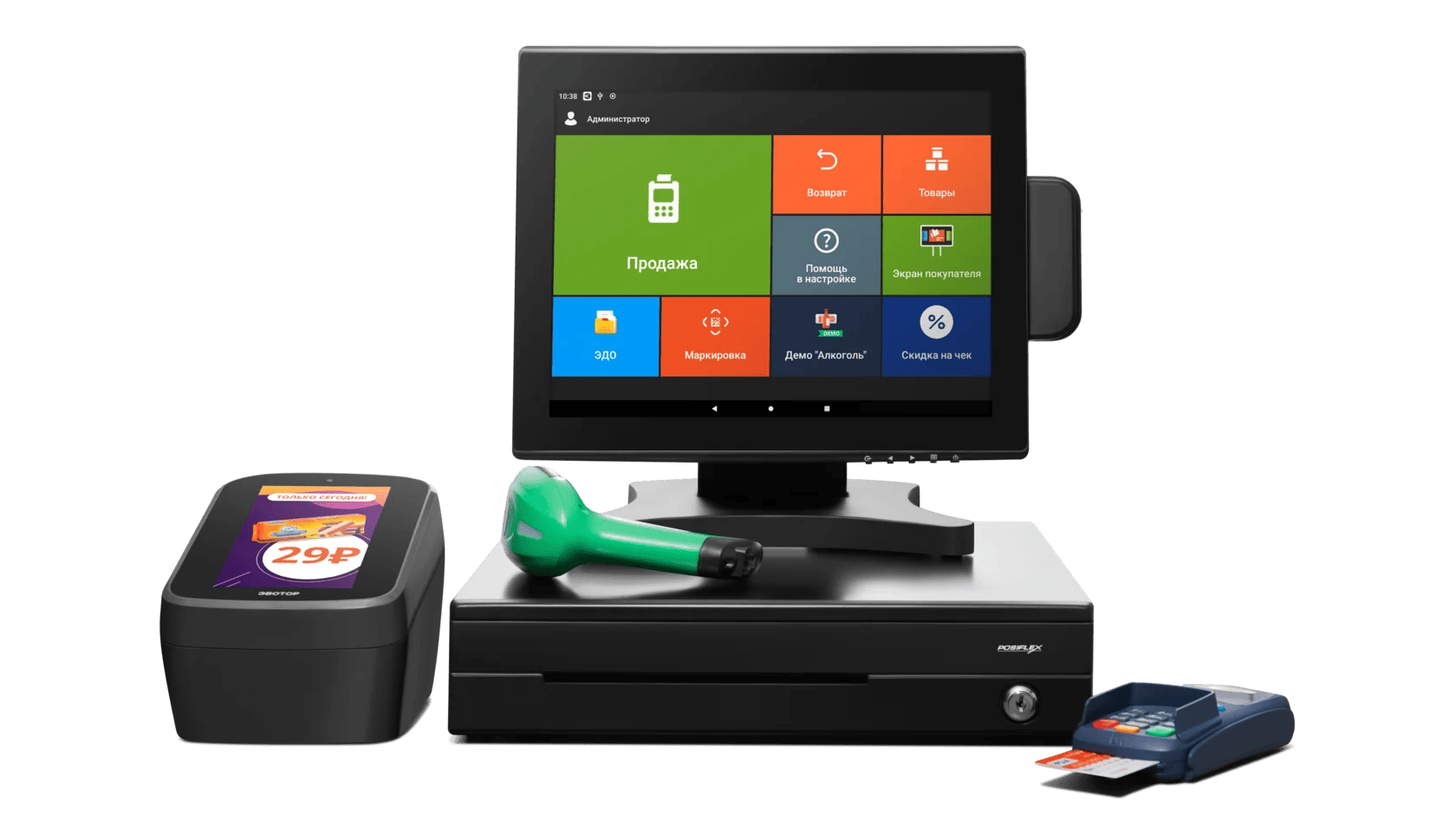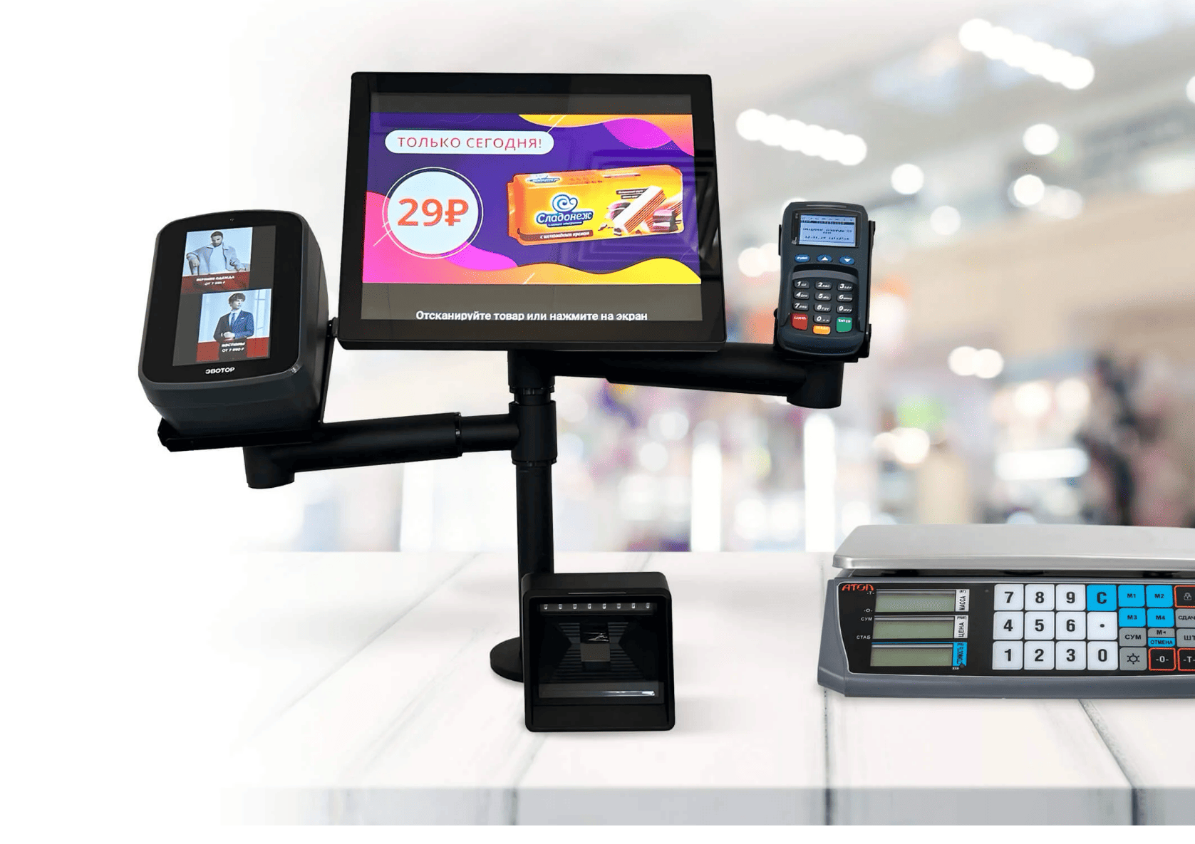 | Дополнительные функции | Сканер, весы, приём наличных, печать чеков | Выбор комплектации под задачи магазина |