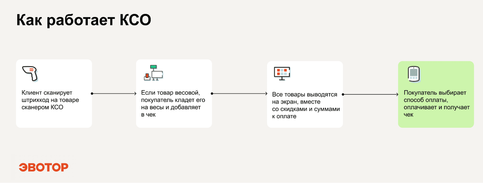По сути, КСО повторяет весь алгоритм кассира, но делает это автоматически, под контролем покупателя и встроенных датчиков.