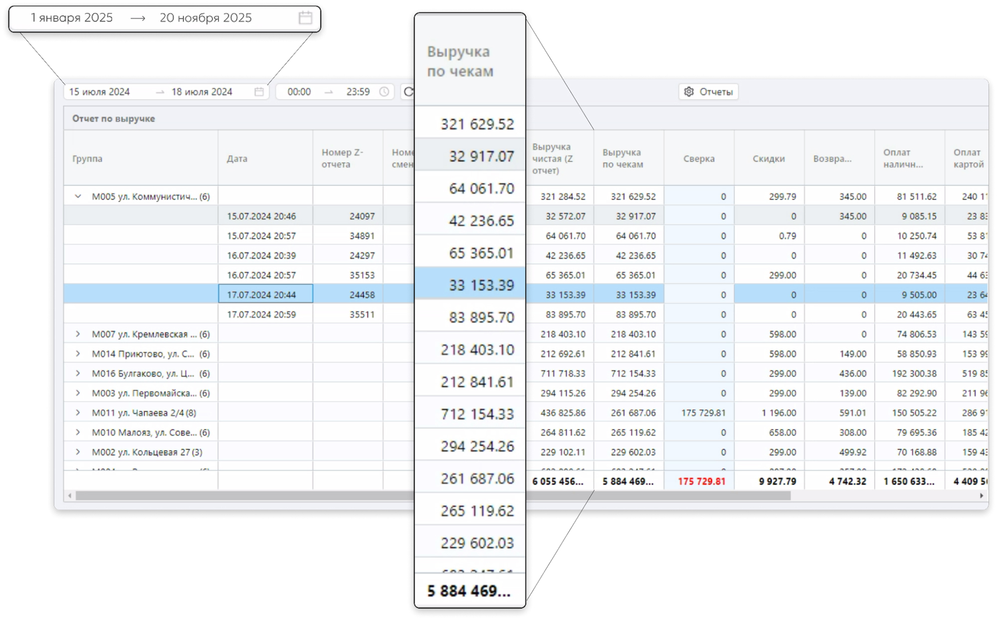 - Смотрите показатель «Выручка по чекам».