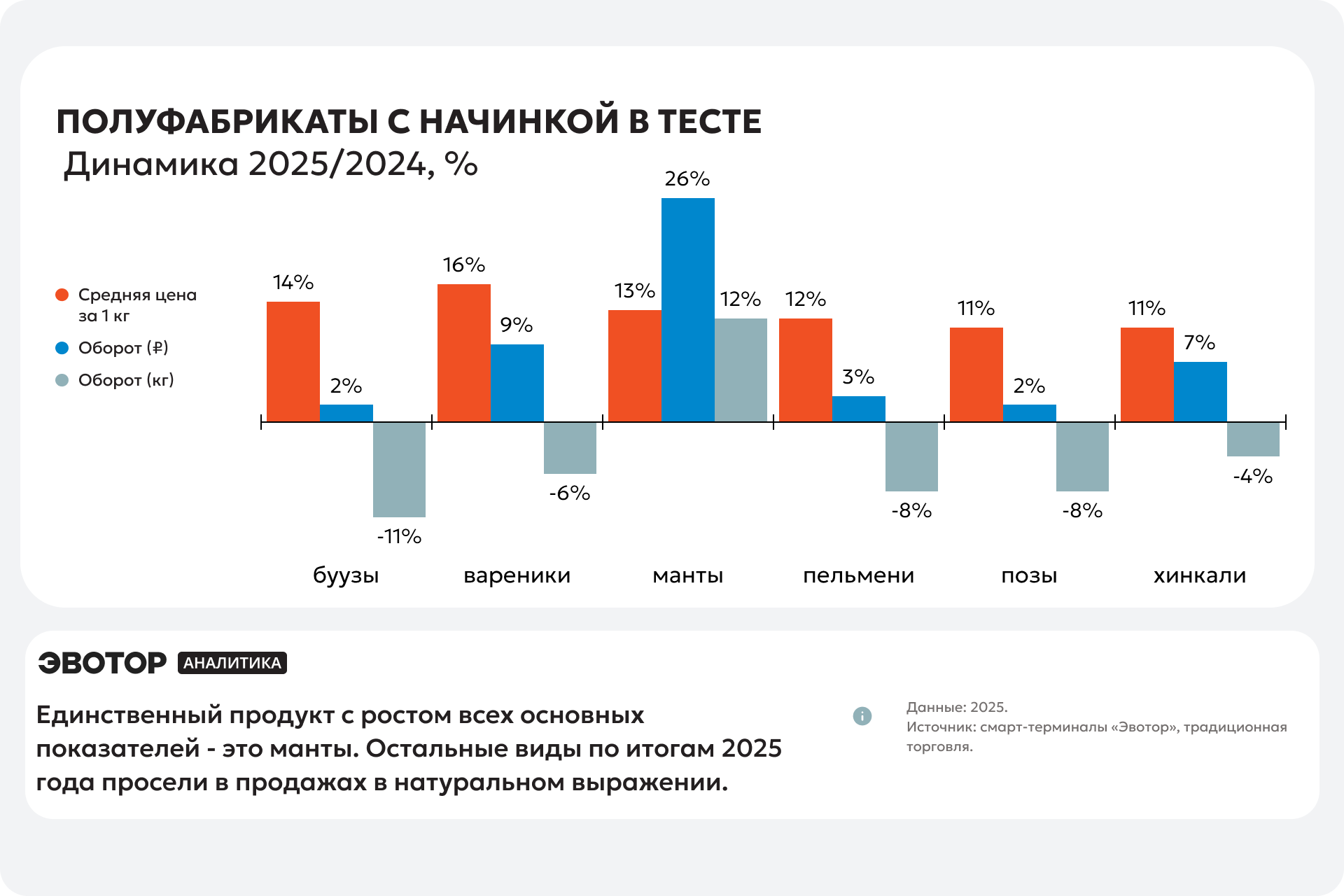 Продажи буузов снизились на 11% в натуральном выражении, но в денежном за счёт инфляции выросли на 2%. Средняя цена буузов за год выросла на 14% до 639 ₽ за килограмм. В декабре 2025 года буузы стоили в среднем 668 ₽ (+11% к декабрю 2024 года). Ассортимент буузов расширился: с 12 брендов до 14, с 10 производителей до 11.