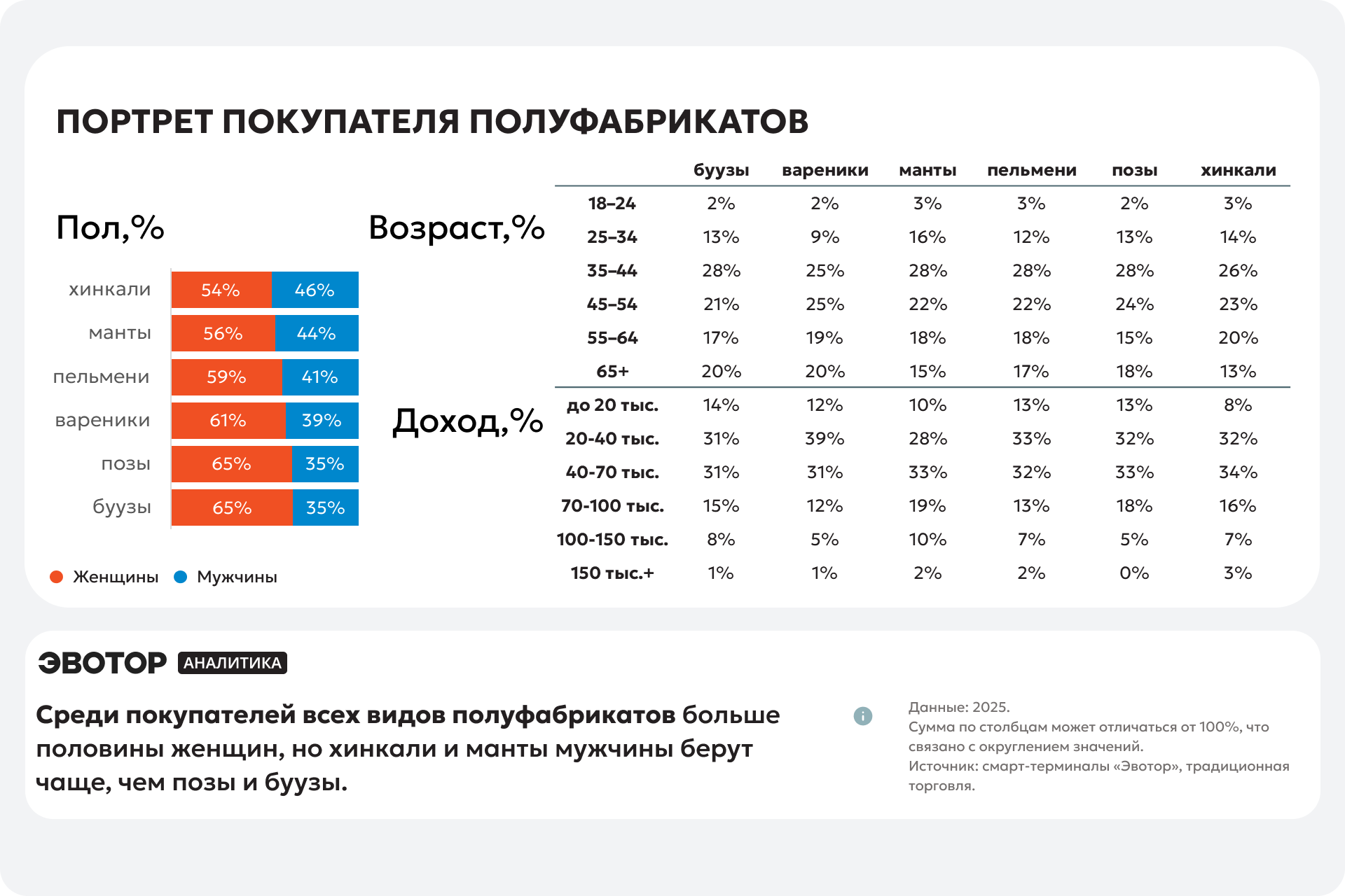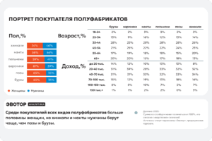 В целом полуфабрикаты этой категории чаще приобретают женщины, но доля по разным блюдам немного отличается. Так, доля покупательниц вареников составила 61%, буузов и поз ― по 65%, пельменей ― 59%, мантов ― 56% и хинкали ― 54%.