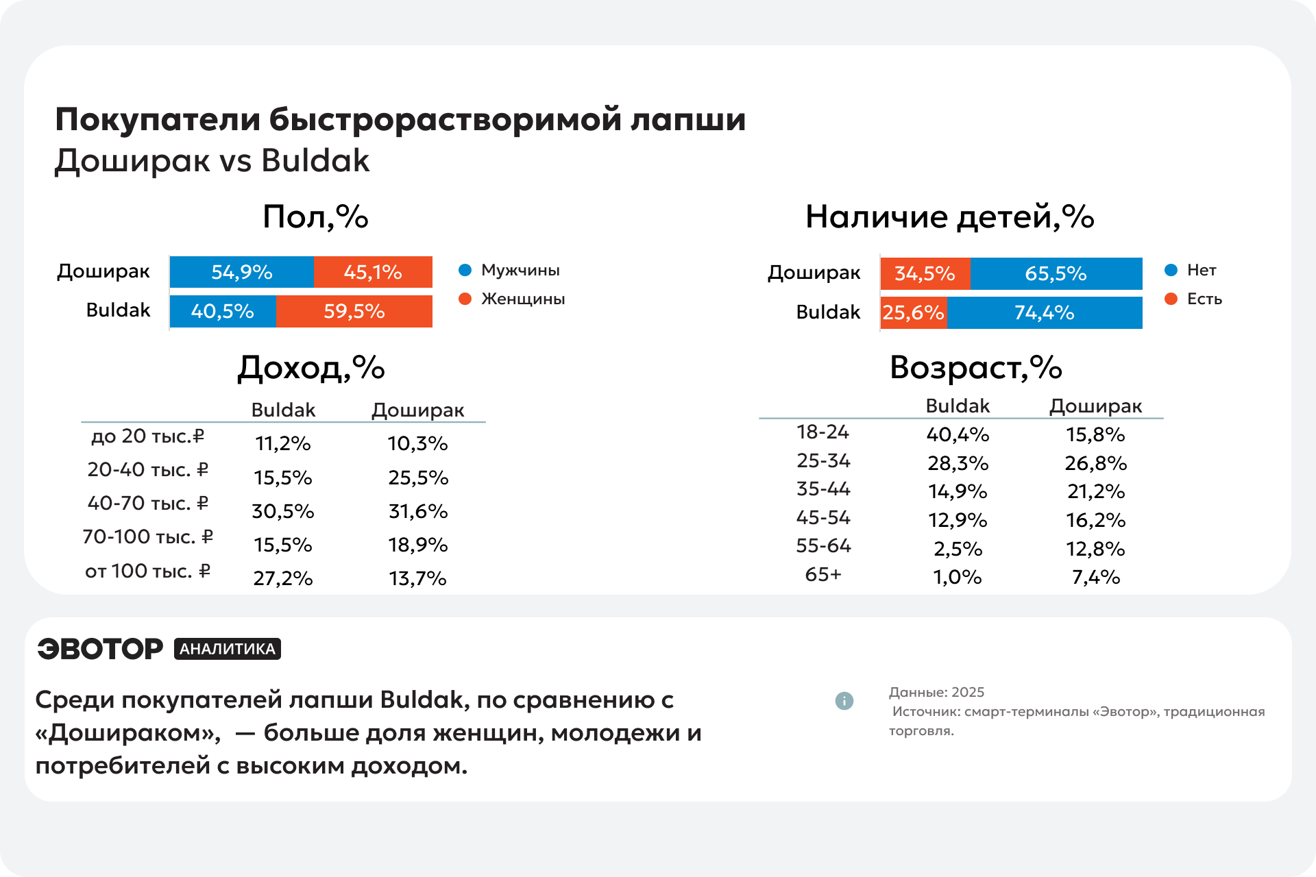 Среди покупателей Buldak ― 59,5% женщины, 74,4% не имеют детей, 40,4% ― в возрасте 18-24 лет и 27,2% с доходом от 100 тыс. ₽.