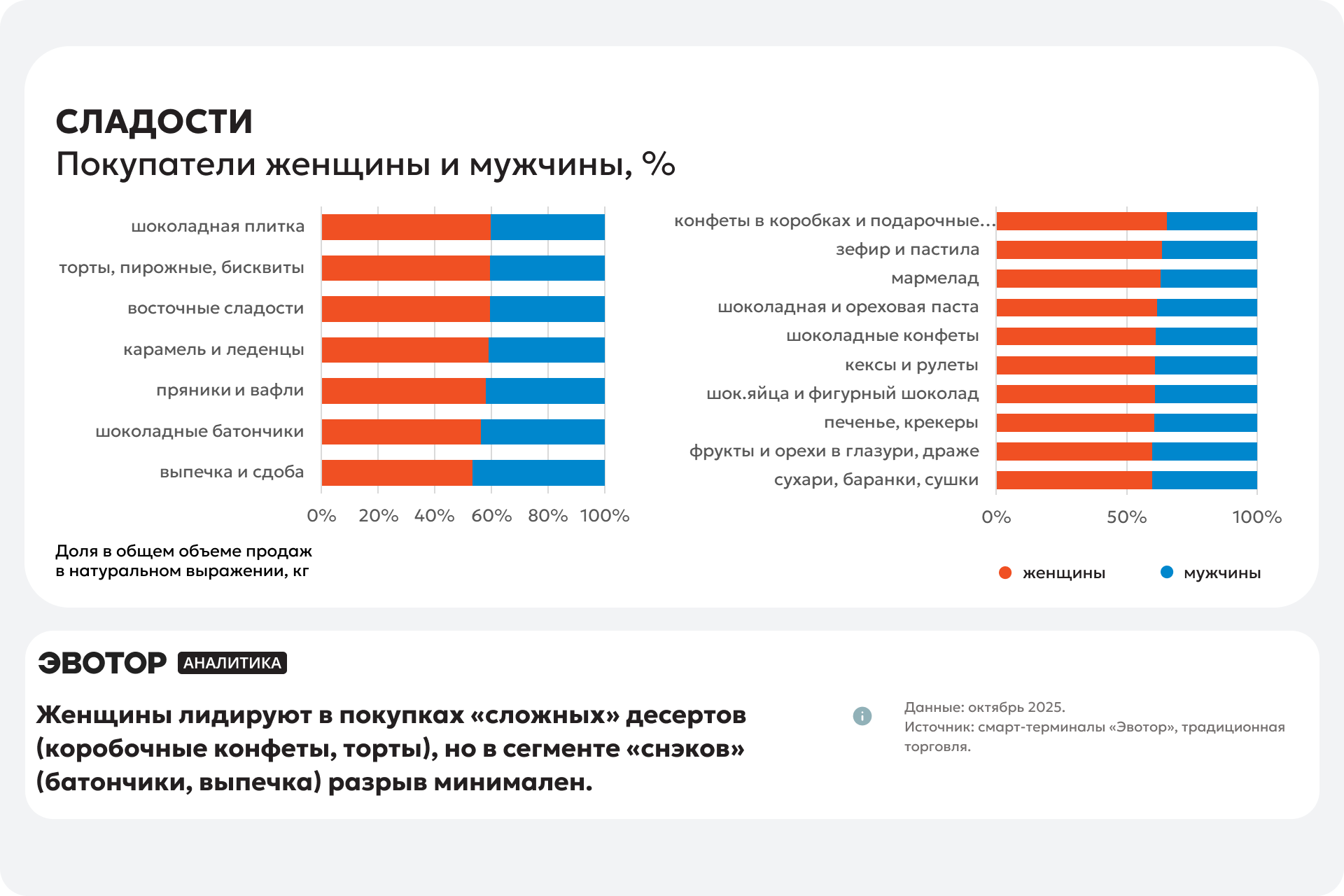 Для анализа социально-демографического портрета использовались данные собственной аналитической панели Эвотора ― EvoPeople Panel. Рассчитывалась доля покупок мужчин и женщин товаров выбранных категорий в общем объеме продаж в натуральном выражении (кг/л) в октябре 2025 года.